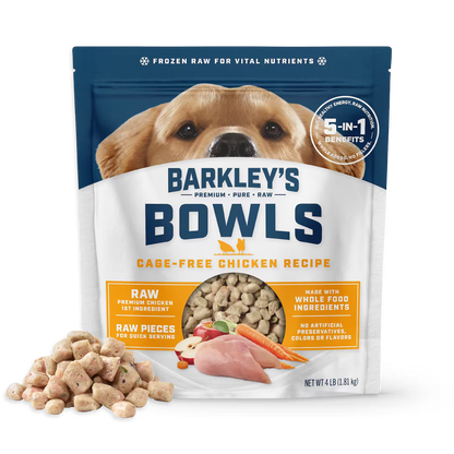 Barkley’s Bowls Cage-Free Chicken Recipe Frozen Raw Dog Food is formulated to meet the nutritional levels established by the AAFCO Dog Food Nutrient Profiles for maintenance.